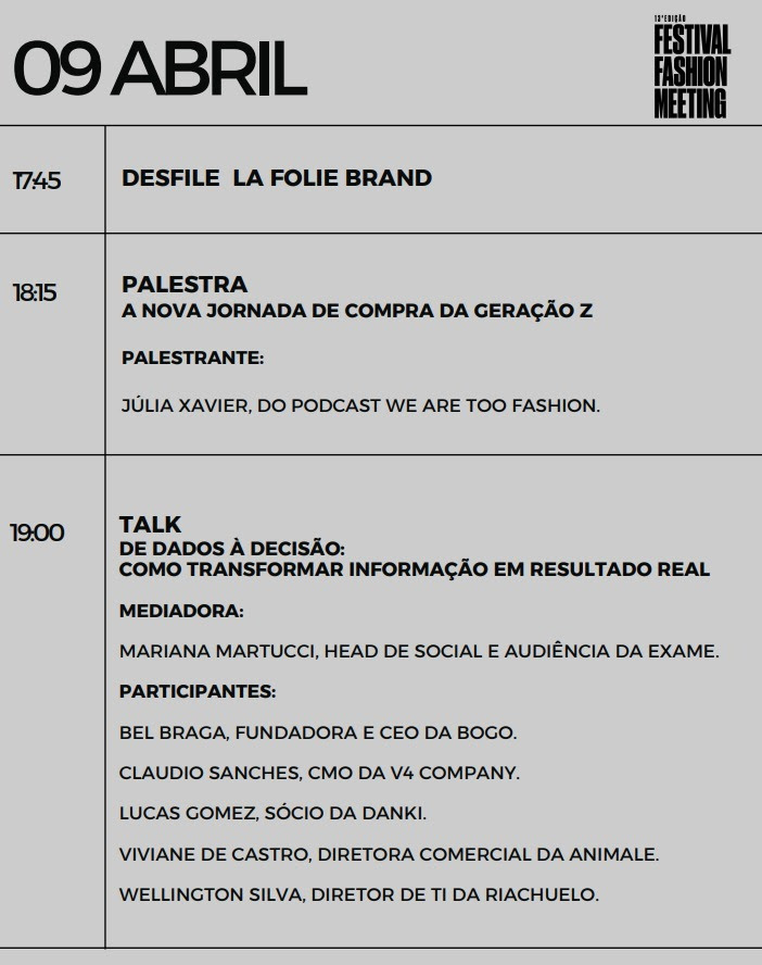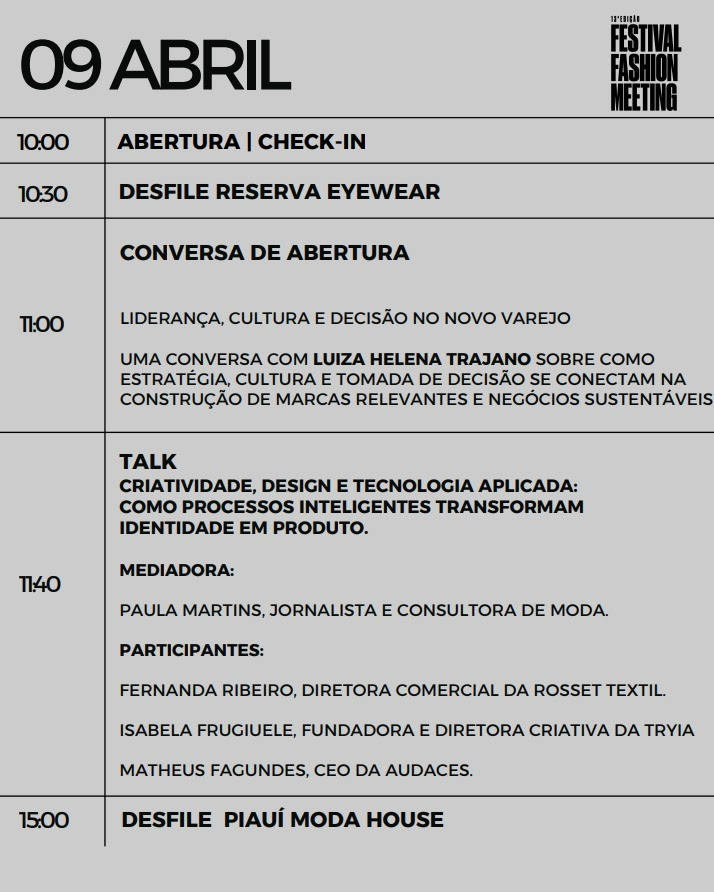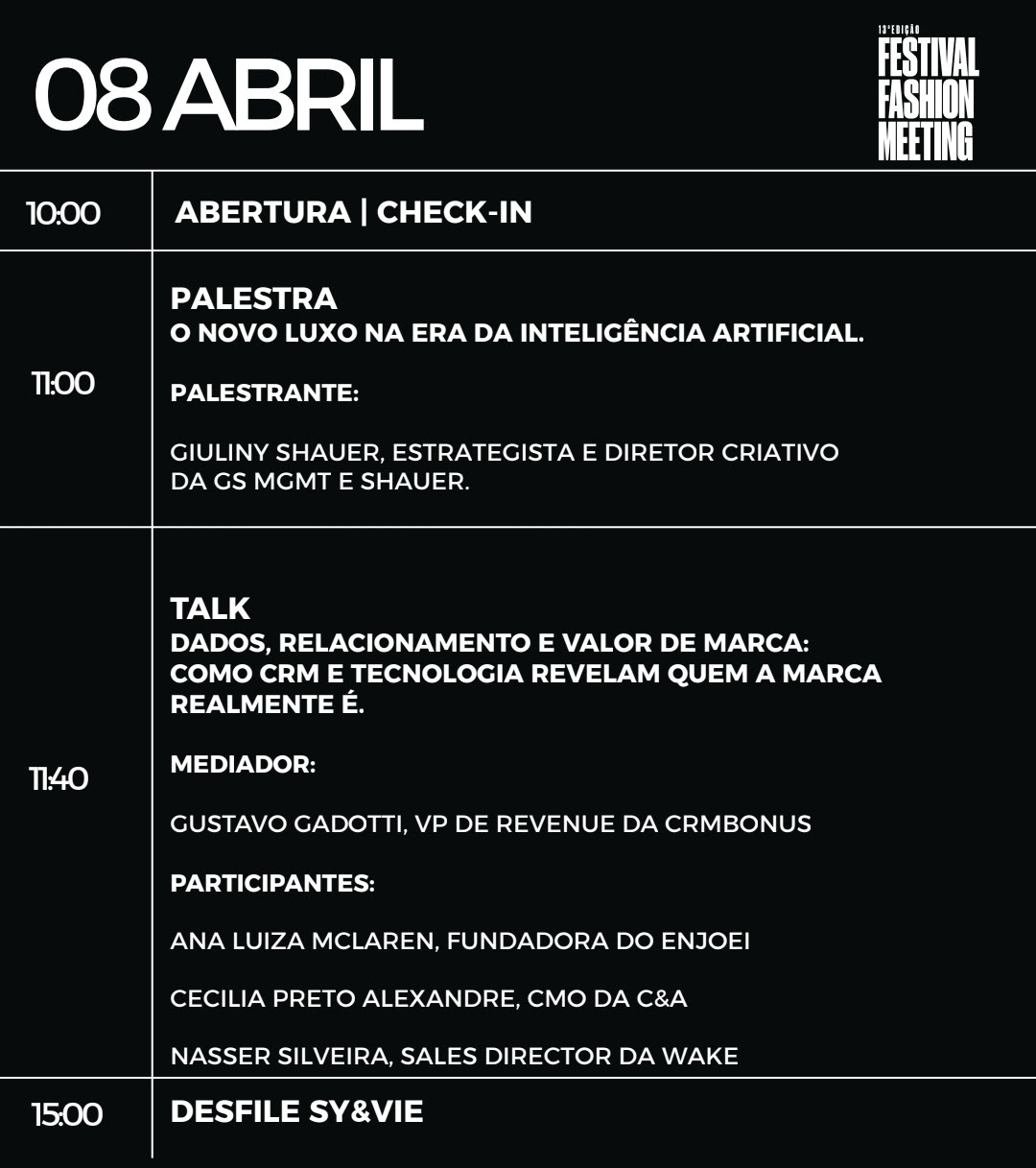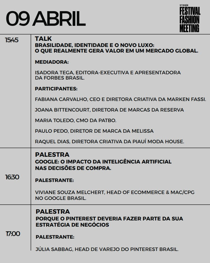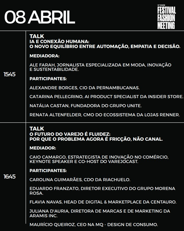 “O Fashion Meeting nasceu da vontade de aproximar pessoas que constroem o mercado no dia a dia e criar um espaço de troca real sobre os desafios da indústria. Chegar aos 10 anos reforça o quanto o conteúdo, o networking e a reflexão estratégica são fundamentais para acompanhar a evolução do setor”, afirma Daniela Dornellas.