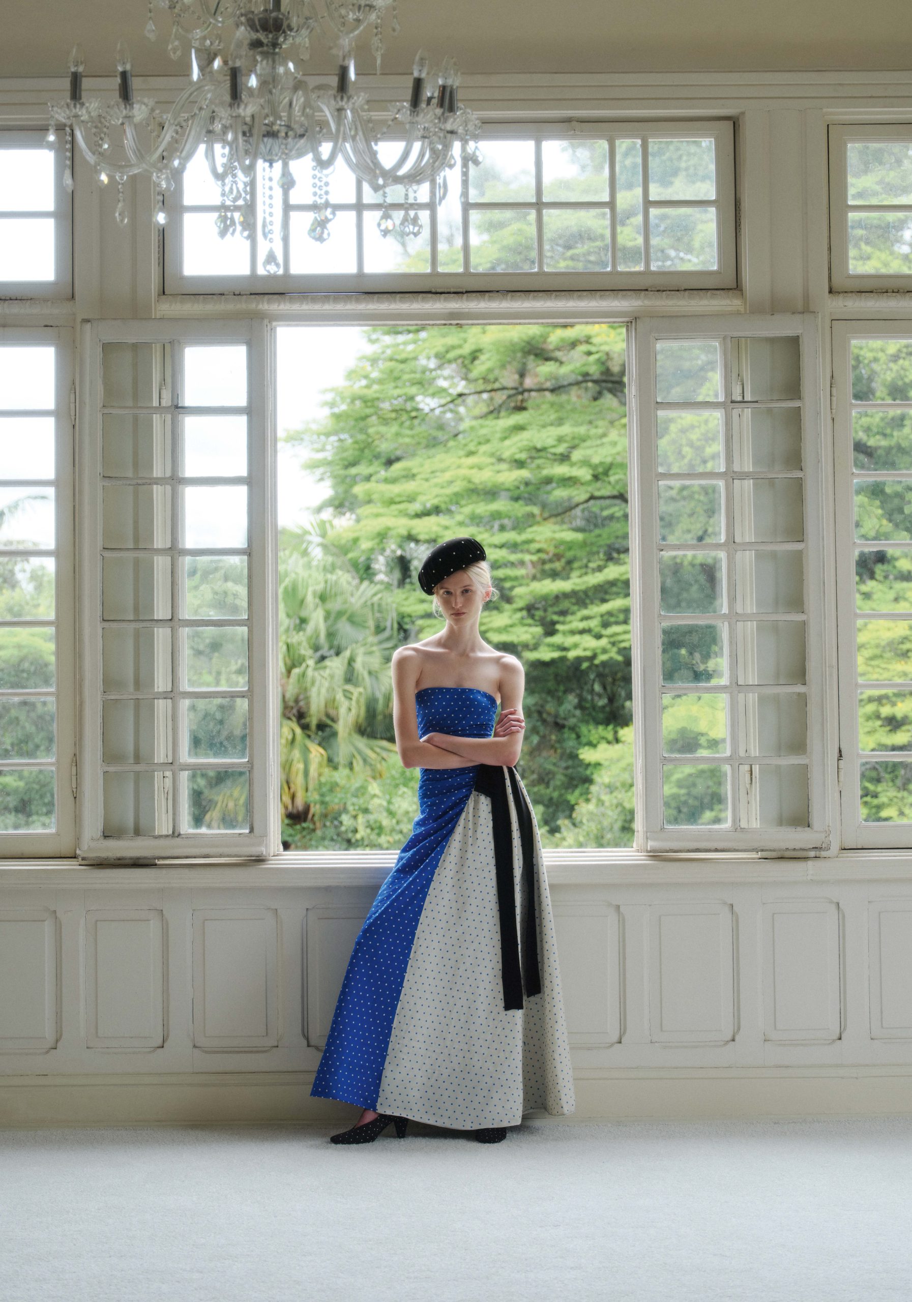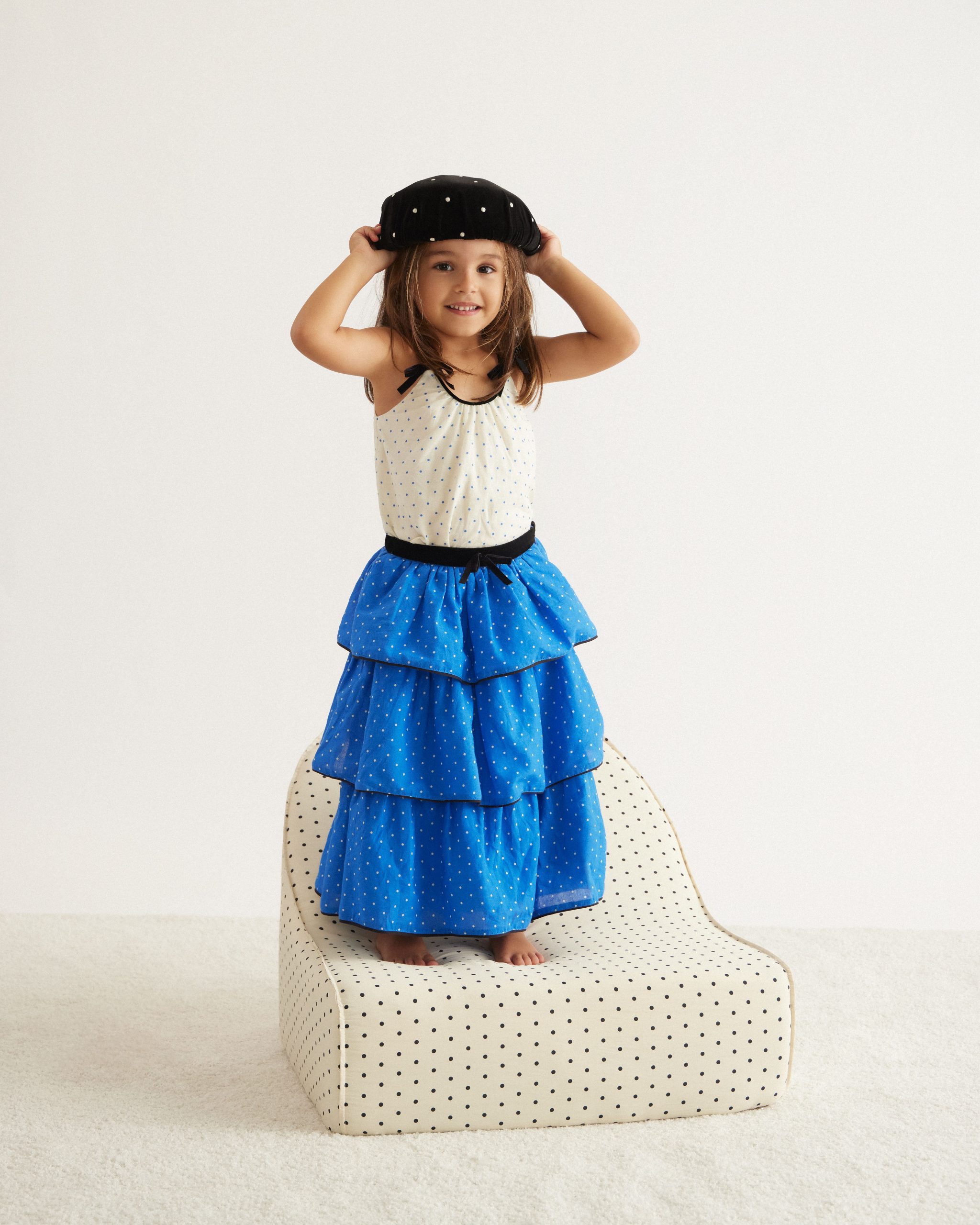 Os vestidos são o destaque do drop e aparecem construídos em camadas que se revelam em movimento, explorando sobreposições e volumes leves. O poá, elemento central de GRAZIE, surge em diferentes escalas, tecidos como o organza e combinações de cor, do preto e off-white ao azul intenso. O Clássico Xadrez se vê reinterpretado em paetê atemporal em saia. O animal printa chega em versões midi e mini ou conjunto de camisa e legging como um mix & match inspirado pelos interiores do Renzo Mongiardino.