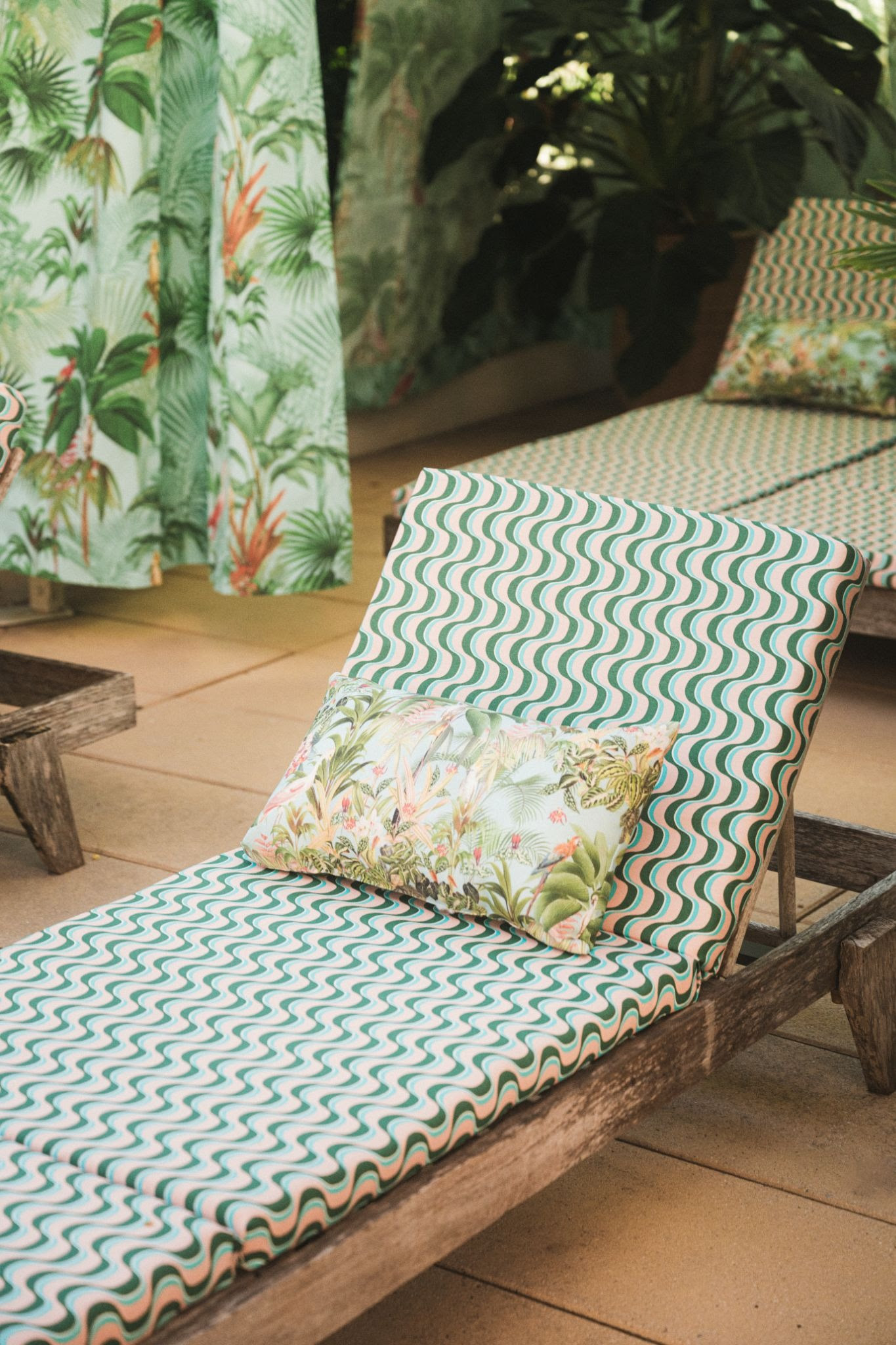 Com uma estampa exclusiva desenvolvida à mão pelo time criativo da PatBO no Brasil, o projeto celebra a tropicalidade sob uma ótica sofisticada e global. Inspirada nas formas do mar e nas nuances da natureza, a arte combina tons de verde, coral e off-white, com ilustrações de ondas, flamingos e palmeiras, um convite a mergulhar em um verão eterno. Essa estampa inédita foi aplicada em móveis e itens de décor como ombrelones, almofadas e espreguiçadeiras, criando uma atmosfera solar e refinada à beira da piscina.