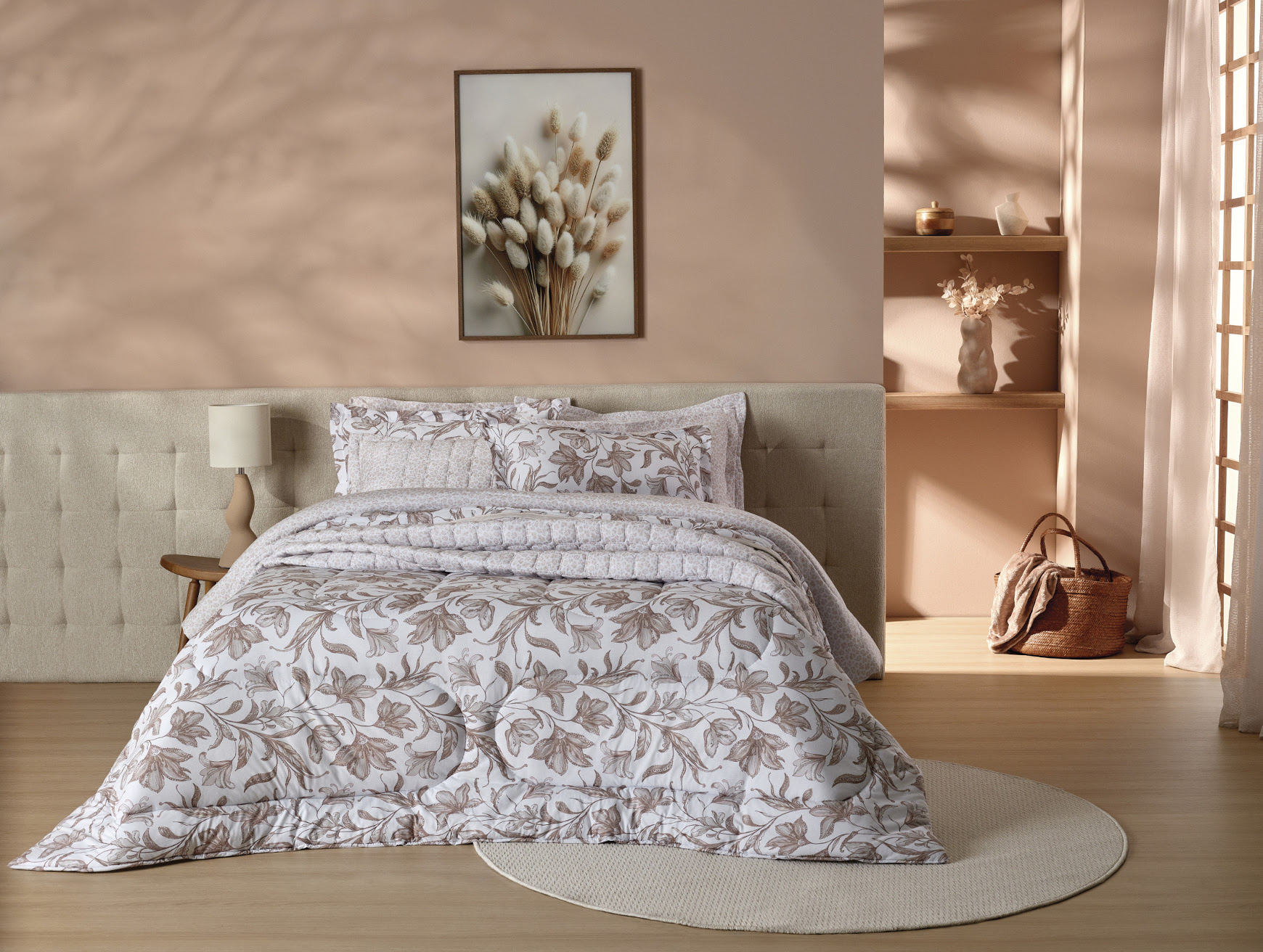 Cooordenados de Cama combinam o floral sutil com grafismos que remetem à onça e à natureza selvagem (Créditos: Atlântica Divulgação).