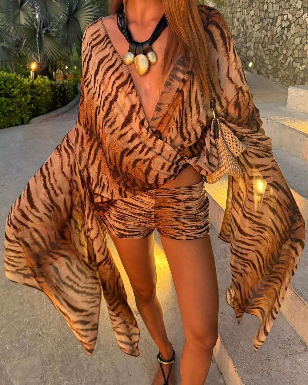 O animal print, especialmente onça e zebra, surge como uma das maiores tendências da temporada, dominando maiôs, biquínis e peças de sobreposição. A estética aparece tanto nos looks de Jordanna quanto nas produções de Hailey Bieber, que vem apostando no maiô de onça como peça fashion do verão, elevando a estampa a um novo patamar de sofisticação.